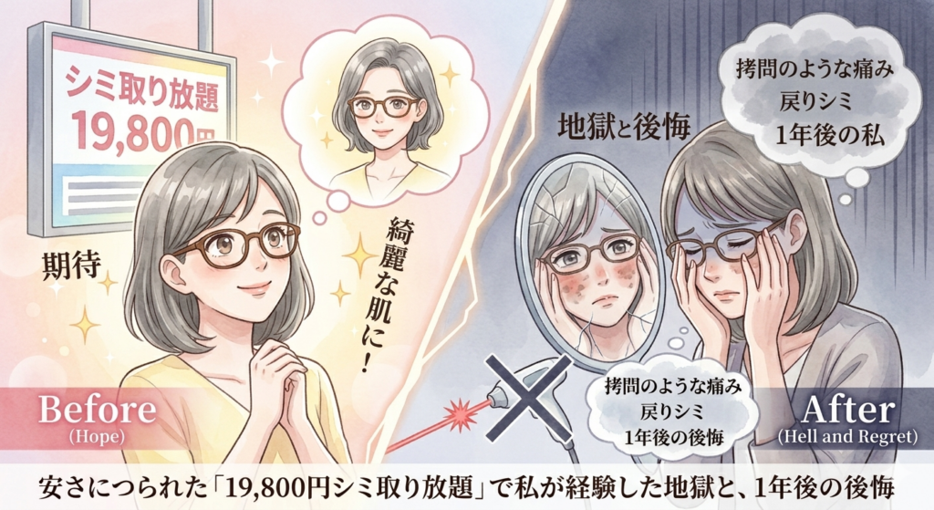 19800円のシミ取り放題は本当にお得?激安レーザーで肝斑が悪化した失敗談をブログにまとめました。激痛の施術、人に見せられないダウンタイム、そして1年後の真実...安易な施術に踏み切る前にぜひ読んでほしい体験記です。